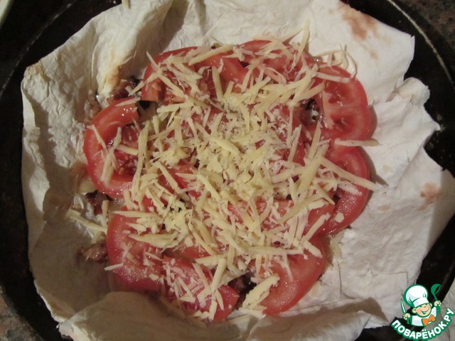 Делаем второй слой лист лаваша должен быть размером по диаметру формы поэтому мы для того чтоб не портить продукт, завернём уголки так что бы края лаваша немного не доходили до бортиков формы. Второй слой выкладываем так же само ( фарш, помидорка, сыр). Третий аналогично (фарш, помидорка, сыр)