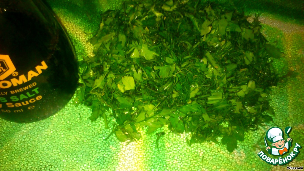 Нарубить зелень, полить соевым соусом.