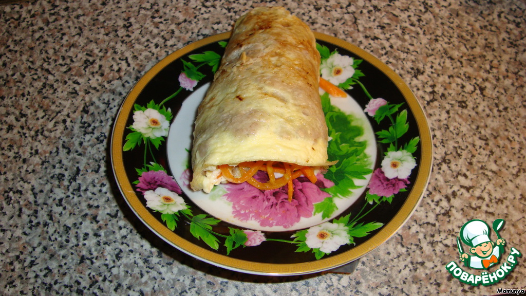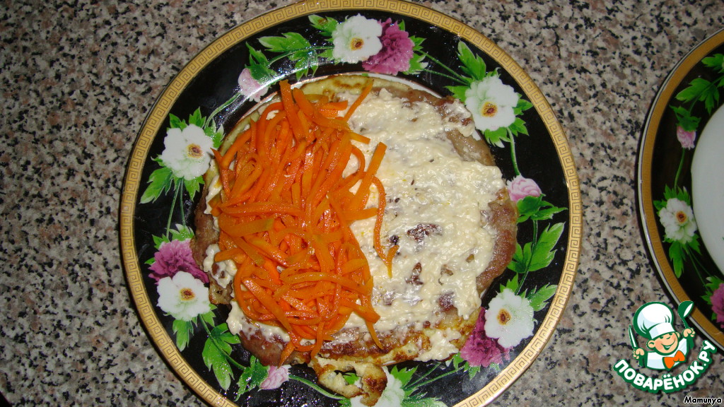 Горячий жареный корж смазываем сырковой массой. Сверху кладём корейскую морковку.