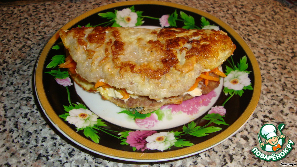 В тарелку налить часть омлетной массы. Положить туда корж из фарша.