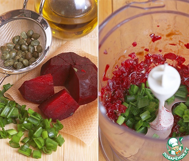 Так же нам понадобится свекла, которую необходимо заранее отварить. Режем ее на несколько кусков, кладем в блендер, туда же промытые и обсушенные каперсы, оливковое масло и бальзамик (я брала крем). Зелень или тоже туда, или порубить отдельно. Я брала зеленый лук, так что второе было удобнее. Смалываем все блендером, но не до каши! Это важно. Кстати если по простому, то каперсы вполне можно заменить на мой взгляд пикантными маринованными огурчиками. Правда они дадут сок, нужно учитывать. Готовую свекольную приправу отставляем в сторону, промариноваться.