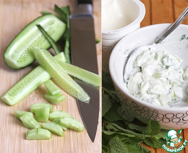 Берем огурцы, очищаем от кожуры, режем на четыре часть, удаляем семена и крупно нарезаем. Смешиваем с порубленой мятой и натуральным йогуртом, по вкусу сдабриваем лимонным соком.