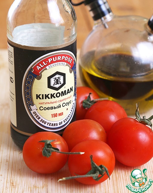 Для томатного гарнира нам понадобятся черри, соевый соус, оливковое масло и бальзамический уксус. Все это мы приготовим и положим рядышком. А жарить будем во время приготовления котлет. Разогреем сковороду, добавим оливковое масло, черри, сбрызнем соевым соусом и балтзамическим уксусом и будем обжаривать на среднем огне. По времени - как Вам захочется. Можно лишь дождаться пока треснет шкурка и томаты прогреются, а можно обжарить их почти до каши. Но все же форму они должны в этом случае сохранить, не упустите.