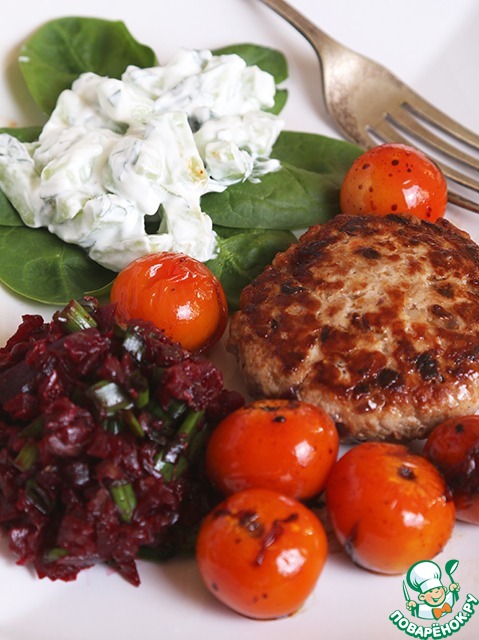 | Котлета из постной говядины со свекольной приправой, огуречной райтой и жареными томатами. Отличное блюдо, которое послужит полноценным, но не слишком тяжелым ужином. |