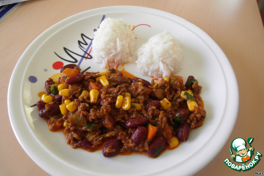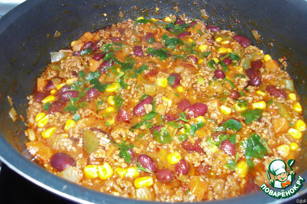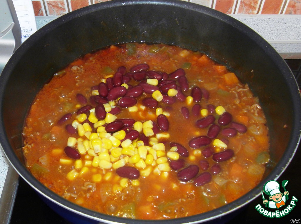 Через 30 мин. добавить кукурузу, фасоль и приправы и тушить еще 20 мин.