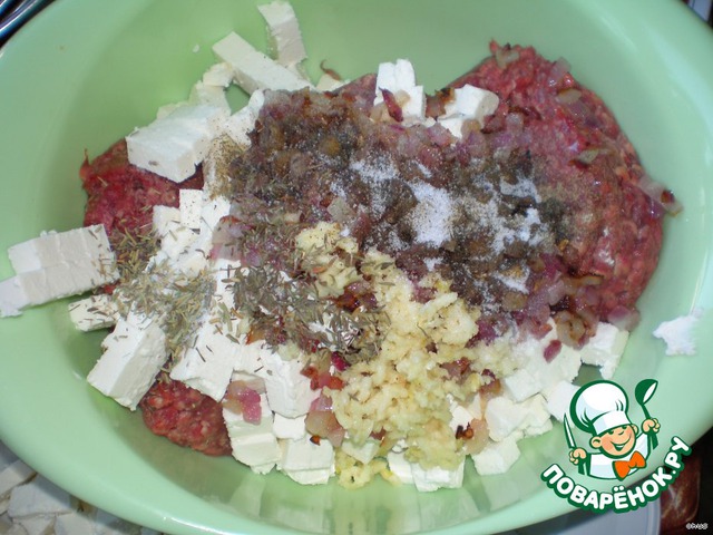 В фарш добавить фету, жареный лук, выдавить чеснок, молотый перец, соль, панировочные сухари, половину сухого розмарина, яйцо, все перемешать.
