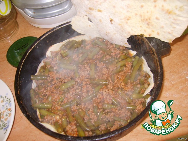 4. Лист лаваша кладем на дно формы, потом ½ получившегося рагу.