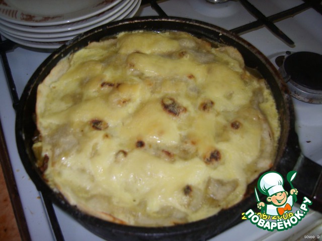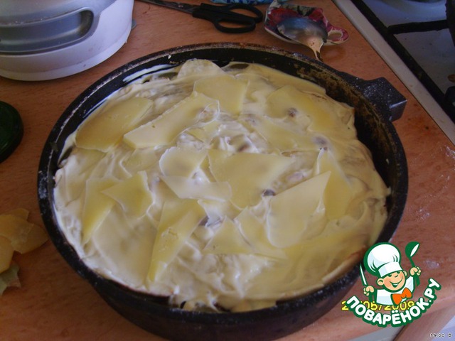 5. Дальше - второй лист, оставшуюся половину рагу, накрываем третьим листом. Смазываем майонезом, сверху сыр (я тоненько нарезала, можно на терке натереть). Запекаем 15 минут.