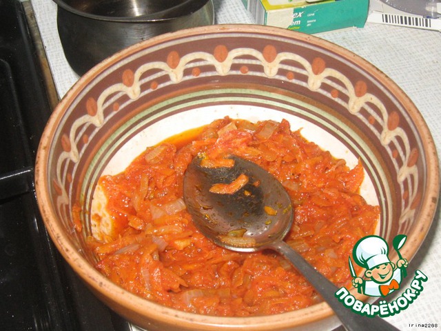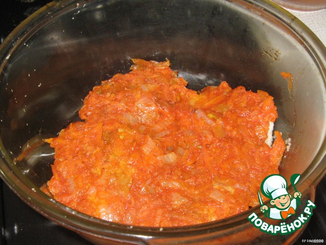 Сначала делаем заправку-соус для рыбы - лук порезать, морковь натереть и обжарить на растительном масле до готовности. Отдельно томатную пасту развести в теплой воде, посолить-поперчить по вкусу, добавить яблочный уксус и всю эту массу влить в морковь с луком. Потушить еще с минуту и выложить на отдельную тарелку