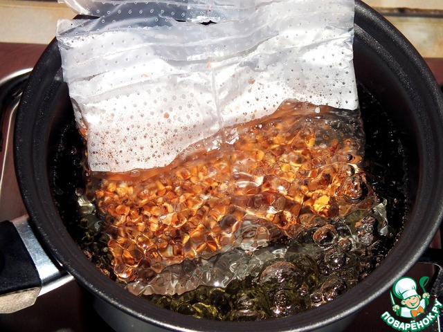 Вода закипела, опускаем пакетики с гречкой и варим по инструкции на коробке - 20 минут