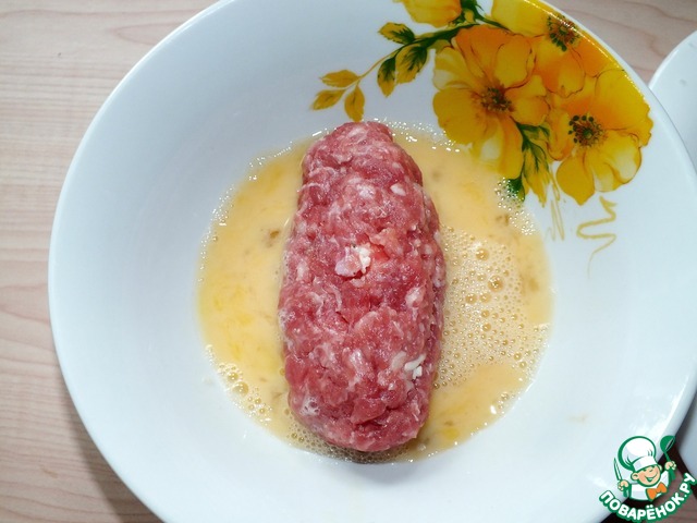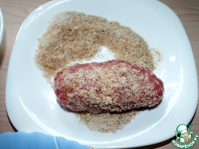 Формируем мясную палочку: в ладони формируем прямоугольную лепешечку, на середину выкладываем натертый сыр, закрываем начинку фаршем со всех сторон, придадим форму длинной котлеты