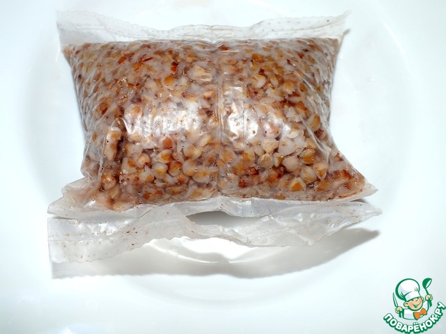 Через 20 минут аккуратно вытаскиваем пакетики с готовой гречкой, открываем пакетик. Выкладываем на тарелку и поливаем топленым маслом. Подаем с горячими мясными палочками.
