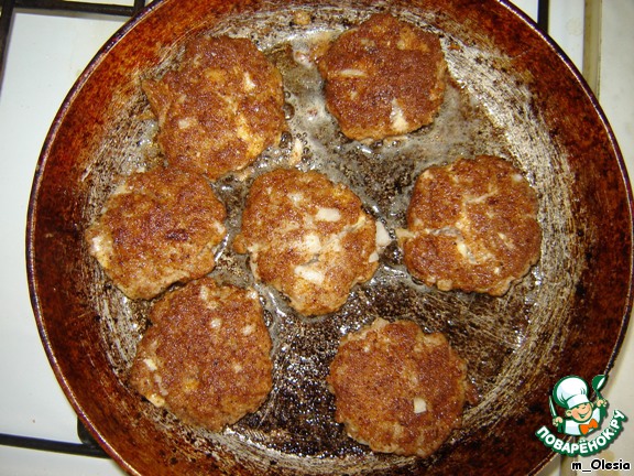 Из фарша формируем лепешки и панируем их в сухарях.