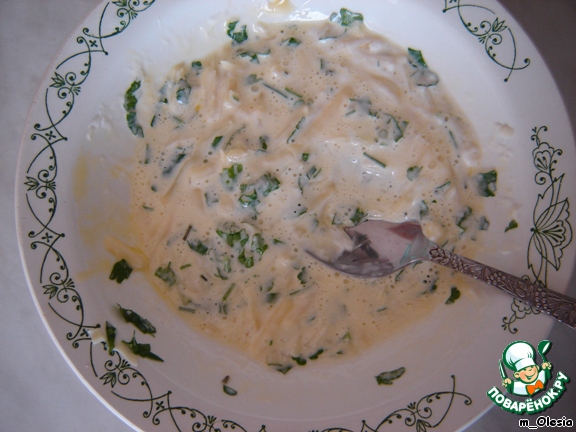 Готовим соус. Для этого смешиваем натертый сыр, зелень, майонез и 1 яйцо.