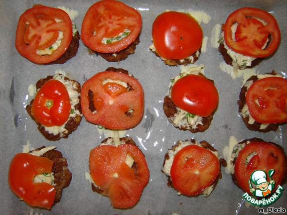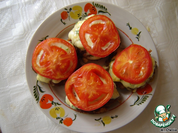 На середину бифштекса кладем немного соуса, а сверху кружочек помидора.