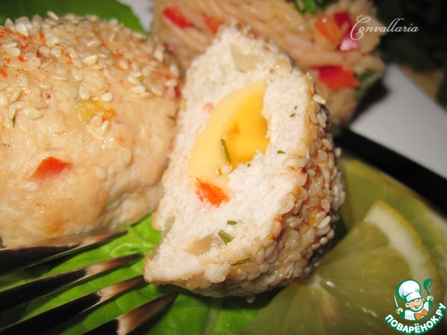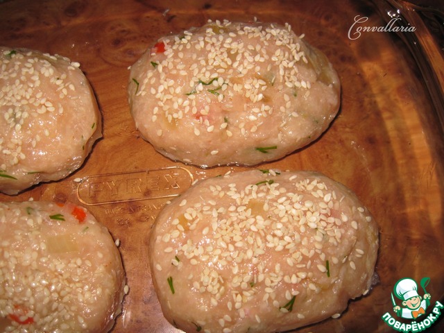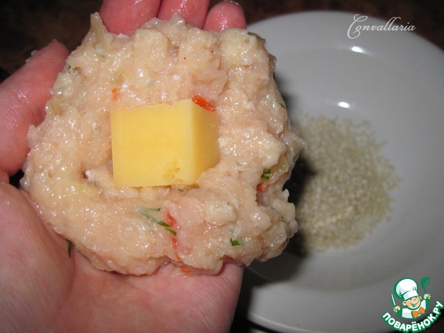 Из фарша сформировать лепешки, в середину каждой положить по кусочку твердого сыра. Сформировать котлету, с одной стороны обмакнуть в кунжут.