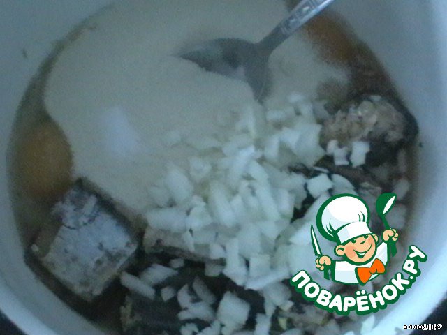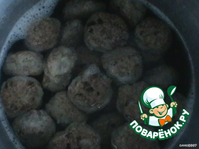 Пожарить маленькие котлетки, класть в кастрюльку и залить все водой. Немного посолить и довести до кипения.