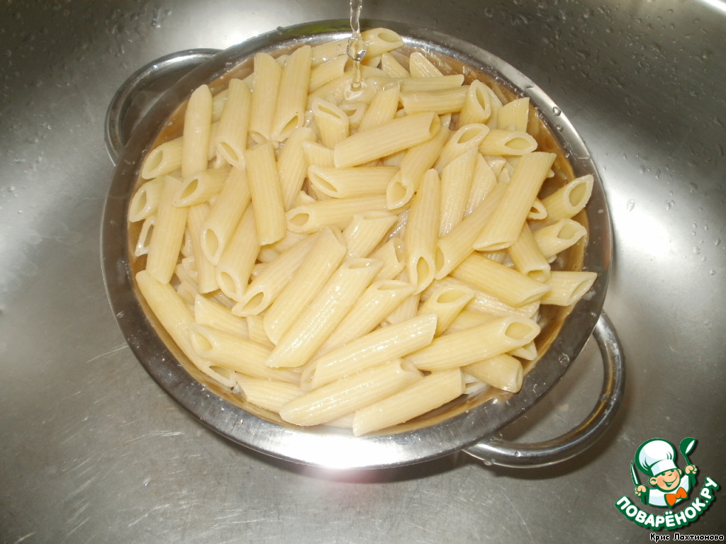 А тем временем, пока все тушится, нам нужно отварить пасту до готовности аль денте (вытянуть за 3 минуты до готовности), откинуть на дуршлаг и промыть под холодной водой (воду сливать всю не нужно, примерно кружечку нужно оставить). Очень хотела попробовать пасту TM Parmalat, но, к моему великому сожалению, в нашей глуши я такую не нашла.:(