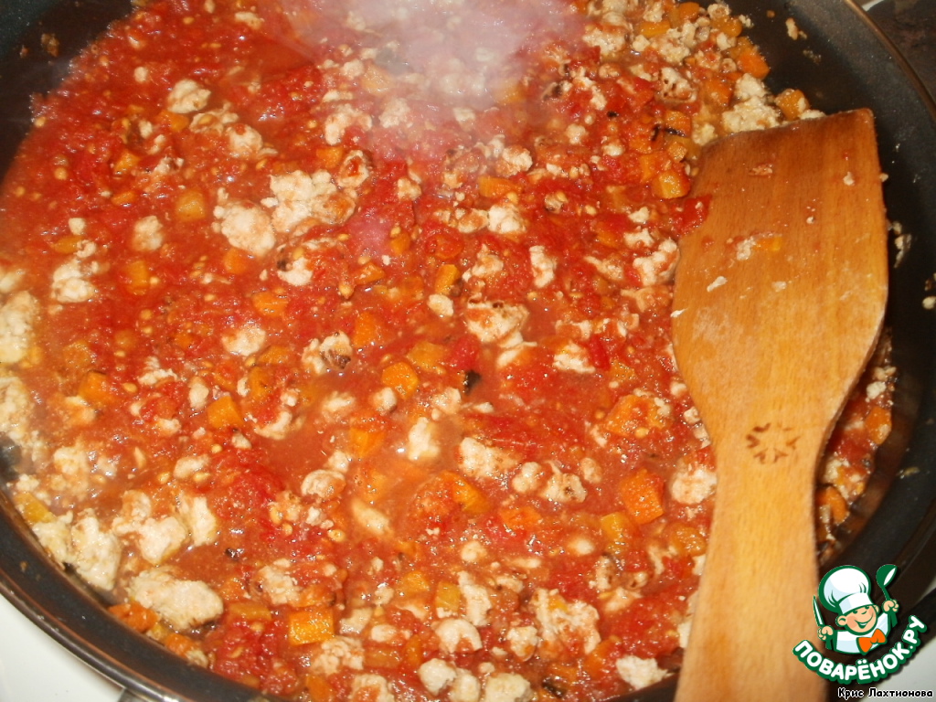 Затем добавить фарш и жарить на маленьком огне 25 минут, постоянно помешивая.