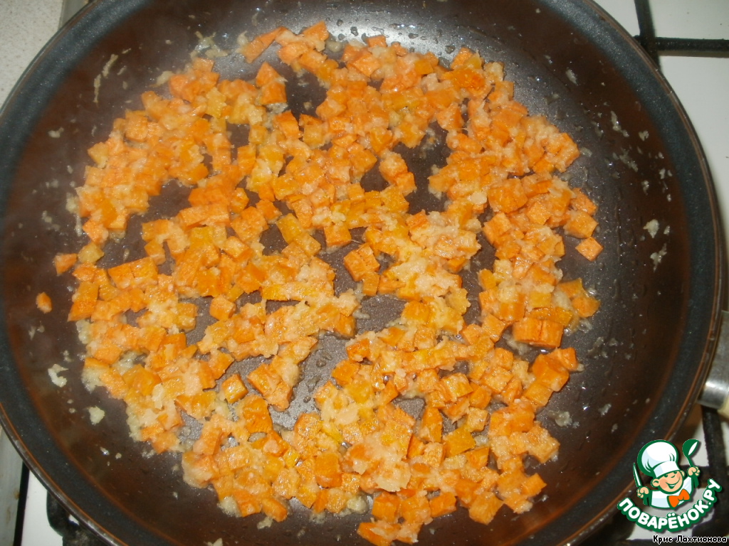 Лук натереть на мелкой терке. Морковь нарезать мелкими кубиками. Обжариваем все на оливковом масле (куда же итальянская кухня без оливкового масла, а его мне прислали прямиком из Италии). Сначала на сковороде обжарить лук, а затем добавить морковь. Пассеровать минут 5-7.