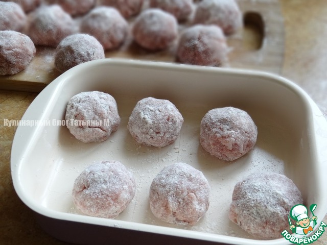 Сформировать из фарша тефтельки, размером с куриное яйцо, обвалять их в муке, оставить столько, сколько нужно для формы. остальное убрать в холодильник в качестве полуфабриката;