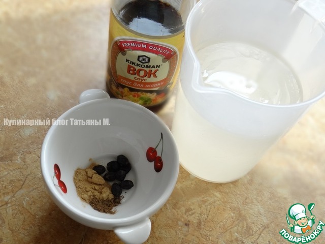 Бульон смешать с соевым соусом, барбарисом, имбирем, перцем;