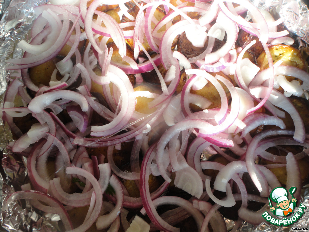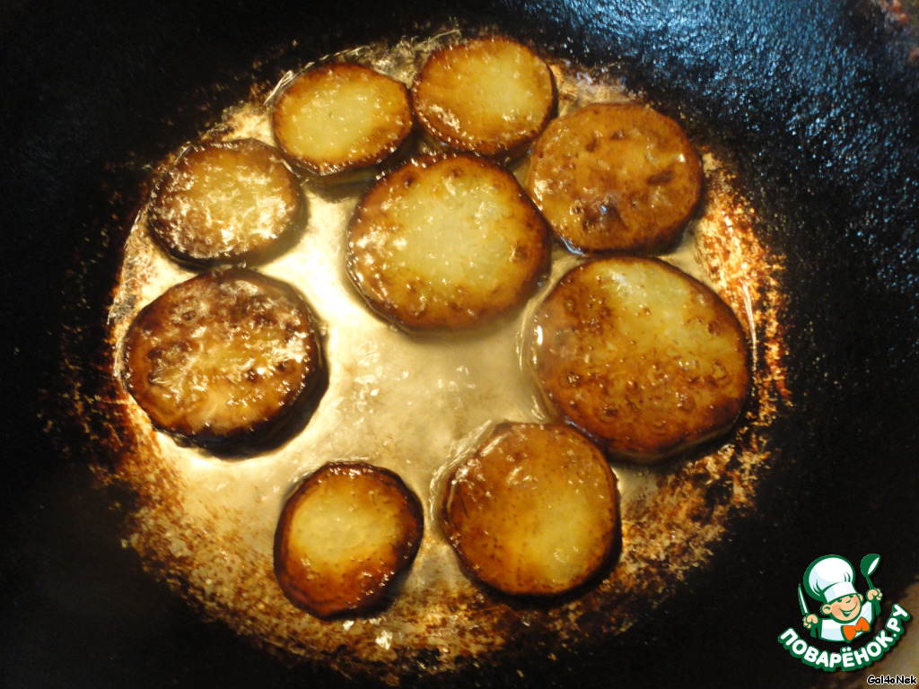 Из двойной фольги формируем круглую форму диаметром примерно 30 см. На дно выкладываем баклажаны. Я уже писала в ингридиентах, что желательно поджарить 2 баклажана, но я приготовила с 1-м. Мне этого показалось маловато. В следуюший раз точно возьму два.