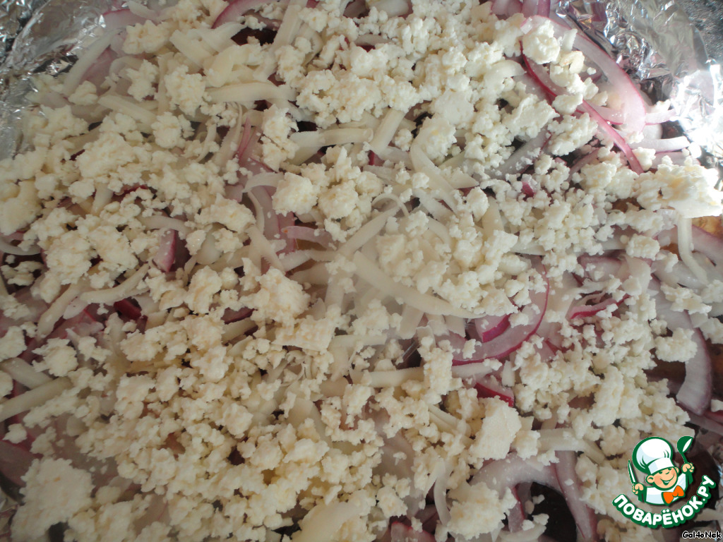 Присыпаем половиной потертой на крупной терке моцареллы и половиной раскрошенной руками брынзы.