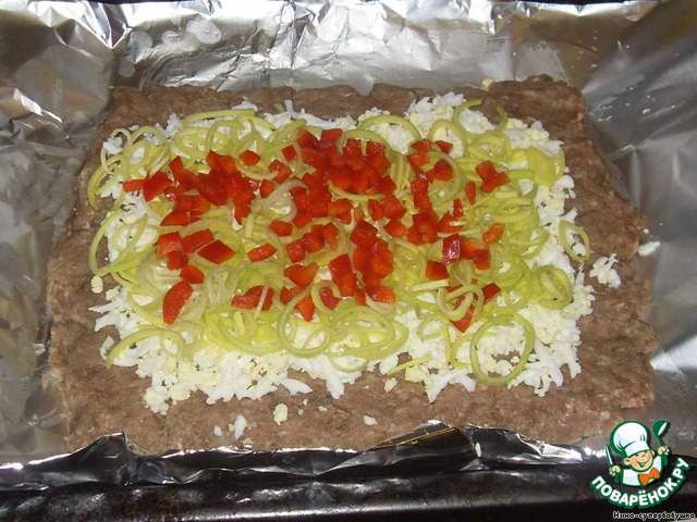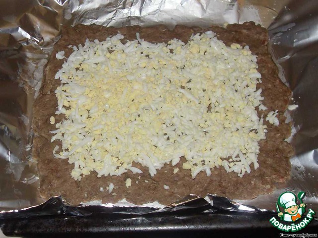 Фольгу смазать маслом, выложить фарш в виде прямоугольника толщиной 1,5-2 см. Сверху посыпать натертыми на крупной терке яйцами.