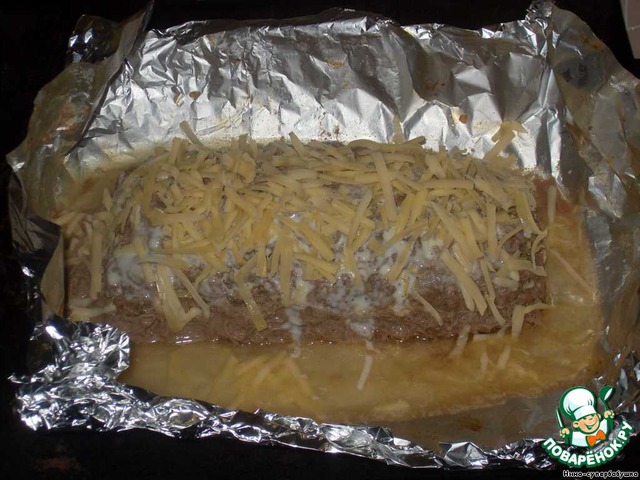 Затем вытащить противень, аккуратно развернуть фольгу, не опуская ее краев слишком низко, опять же, чтобы не растекся мясной сок. Смазать рулет майонезом (можно и сметаной), посыпать тертым сыром и снова отправить в духовку еще на 25 минут. Вот тут можно температуру немного снизить, чтобы верх рулета не подгорел или слишком сильно не засох.