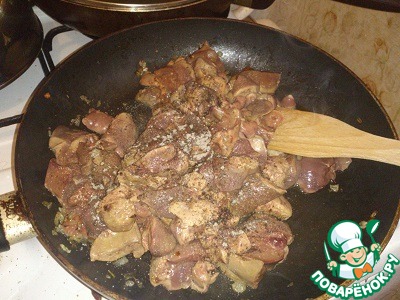 Соединяем печеночный фарш с грибами (если собираетесь готовить грибной соус, то оставьте немного грибов для него)