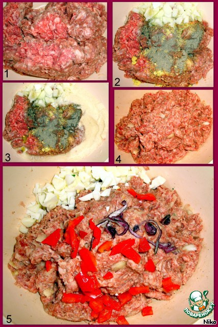 2-фарш, лук, солёная приправа, соль, чёрный перец.
