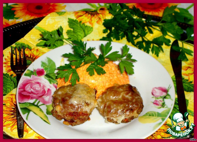 Выложить котлеты в смазанный маслом противень. Сверху прикрыть твёрдым сыром. Поставить в разогретую духовку минут 10-15