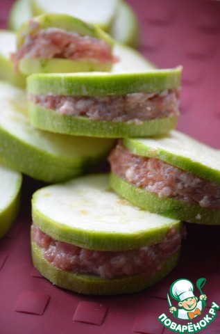 Нарезать кабачки кружочками толщиной 1см. В каждом ломтике сбоку сделать надрез и тонким ножом прорезать вглубь, чтобы получилось подобие кармашка, куда будет вкладываться фарш.