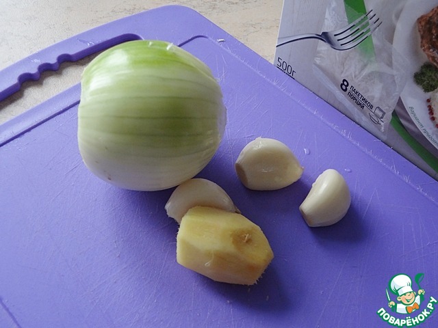 Почистите лук, чеснок и имбирь. Поставьте кастрюлю с водой для варки риса на огонь.