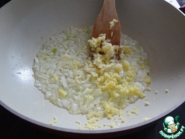 Раскалите растительное масло в вок сковороде (или просто в глубокой), выложите порезанный лук, обжарьте пару минут, затем с помощью чеснокодавки измельчите лук и чеснок прямо в сковороду, перемешайте. Подержите на огне минутку.