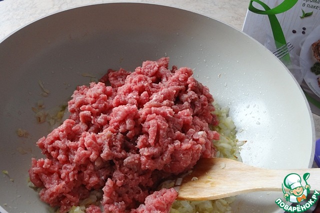 Добавьте фарш и жарьте на сильном огне минут 5. Убавьте огонь.