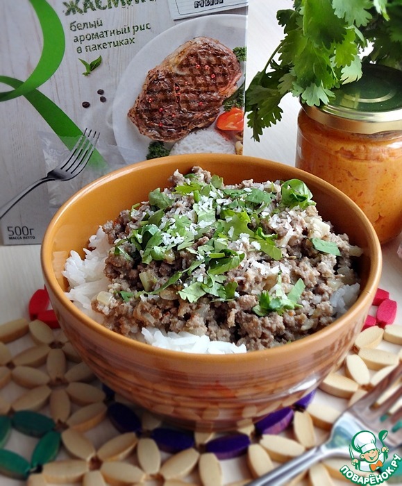 Выложите сверху мясной соус, посыпьте кинзой и кокосовой стружкой (по желанию). Пряное, ароматное, сочное блюдо готово!