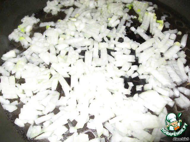 Отвариваем макароны. Лук мелко режем и слегка обжариваем. Добавляем мелко нарезанный чеснок и еще немного жарим до золотистого цвета.
