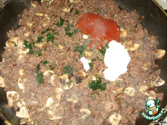 Добавляем сметану, томатный соус, соль, перец и мелко нарезанную зелень. Перемешиваем, выдерживаем на огне еще две-три минуты.
