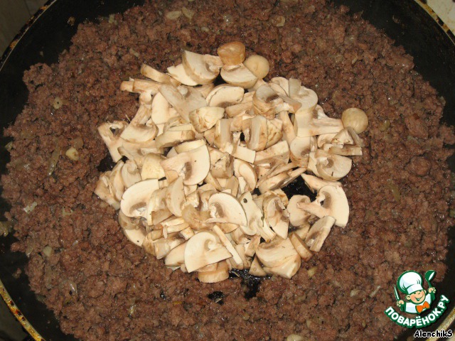 Когда фарш обжарится, добавляем мелко нарезанные грибы и жарим еще минут 5 на большом огне.