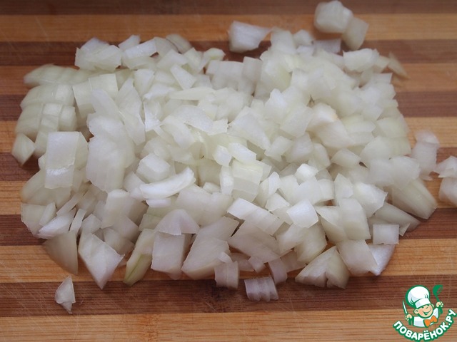 Пока варится рис сформируем и приготовим наши мясные пирожные. Чистим лук, моем, нарезаем кубиками.