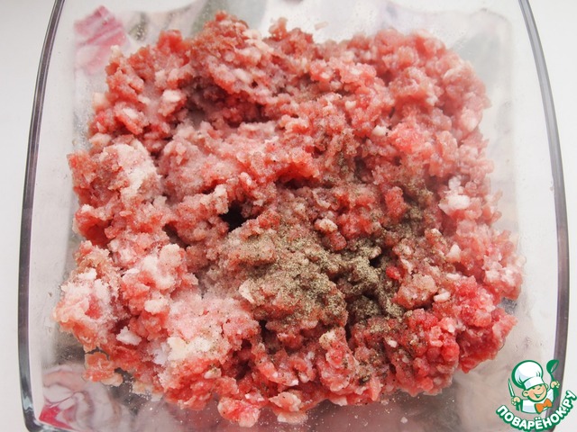 Мясной фарш (у меня заранее перекрученная свинина+говядина) солим (1/2 ч. л.), перчим.