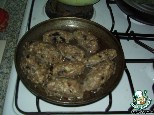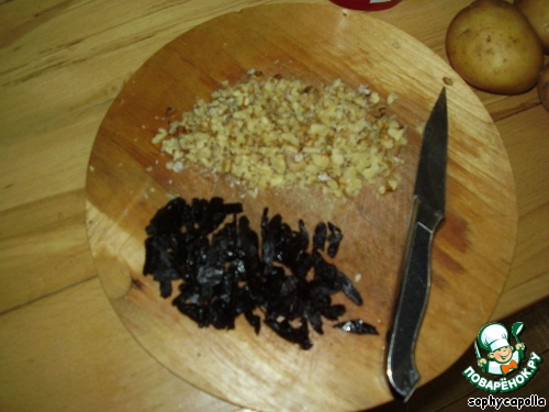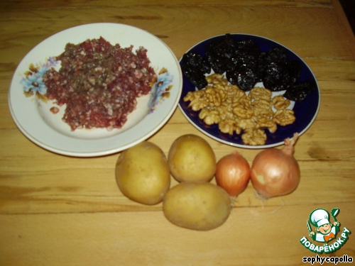 Мясо, лук, картофель пропустить через мясорубку, добавить нарезанный чернослив, дробленые орешки, яйцо и специи...