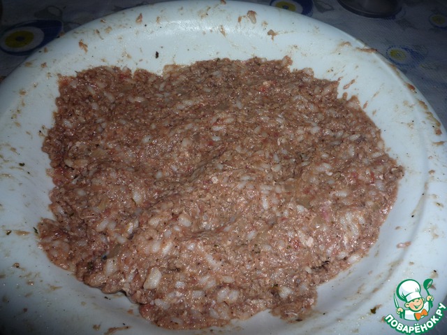 В миску кладем сырой фарш, рис, разбиваем 1 яйцо, добавляем тушеный фарш с луком, солим, перчим (специи по вкусу) и хорошенько перемешиваем. Выжимаем сок с 1/3 лимона в фарш. Снова вымешиваем. Дать фаршу настояться в холодильнике около 1 часа.