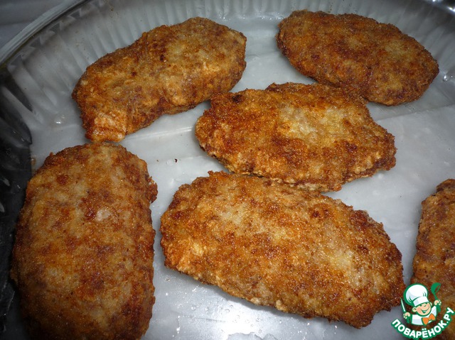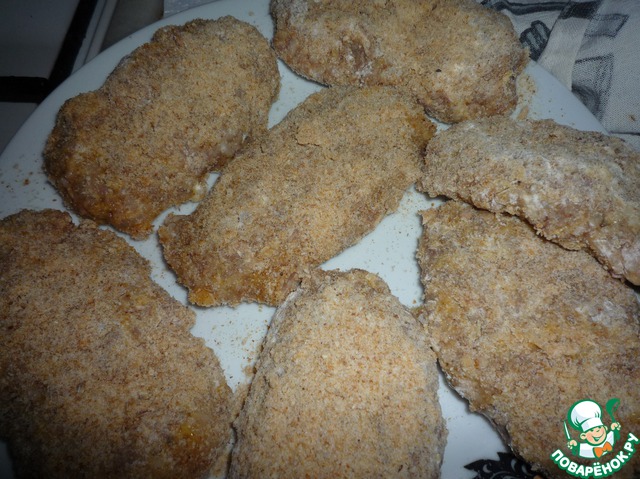 Берем 3 миски. В одну сыплем муку, в другой - яйцо, в третьей - панировочные сухари. Сформировать котлеты, сначала обвалять в муке, затем обмакнуть в яйце и сухарях.