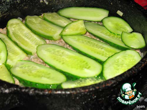 Огурцы порезать вдоль тоненькими ломтиками. Кладем их сверху фарша, закрываем крышкой, уменьшаем огонь и тушим минут 5.