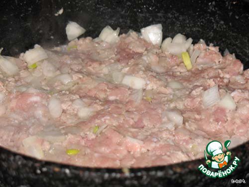 В глубокой сковороде раскаляем масло. Вылкладываем фарш с мелко порезанным луком, не солим. И жарим 10 минут, периодически помешивая.