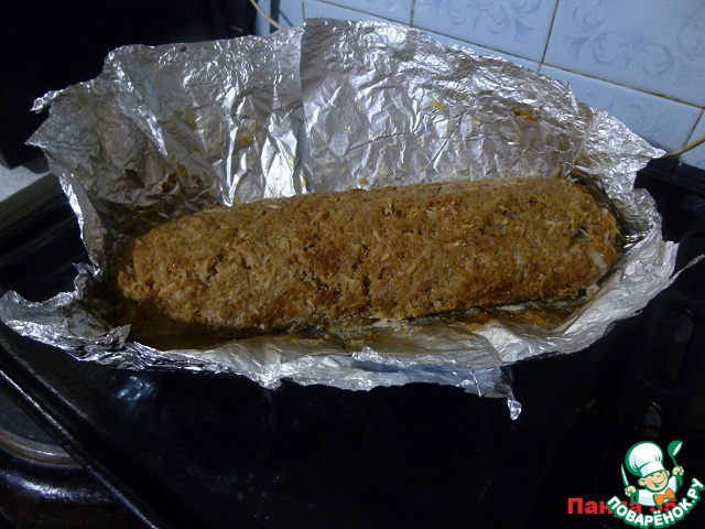 Перекатываем рулет на лист фольги, заворачиваем с всех сторон так, чтобы получилась "конфета". Выкладываем на противень, ставим в разогретую до 200 градусов духовку на 30 минут.