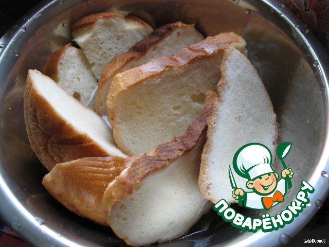 Замачиваем в тёпленькой водичке черствый белый хлеб. Можно использовать молоко. Просто в этот момент молока как-то не оказалось!